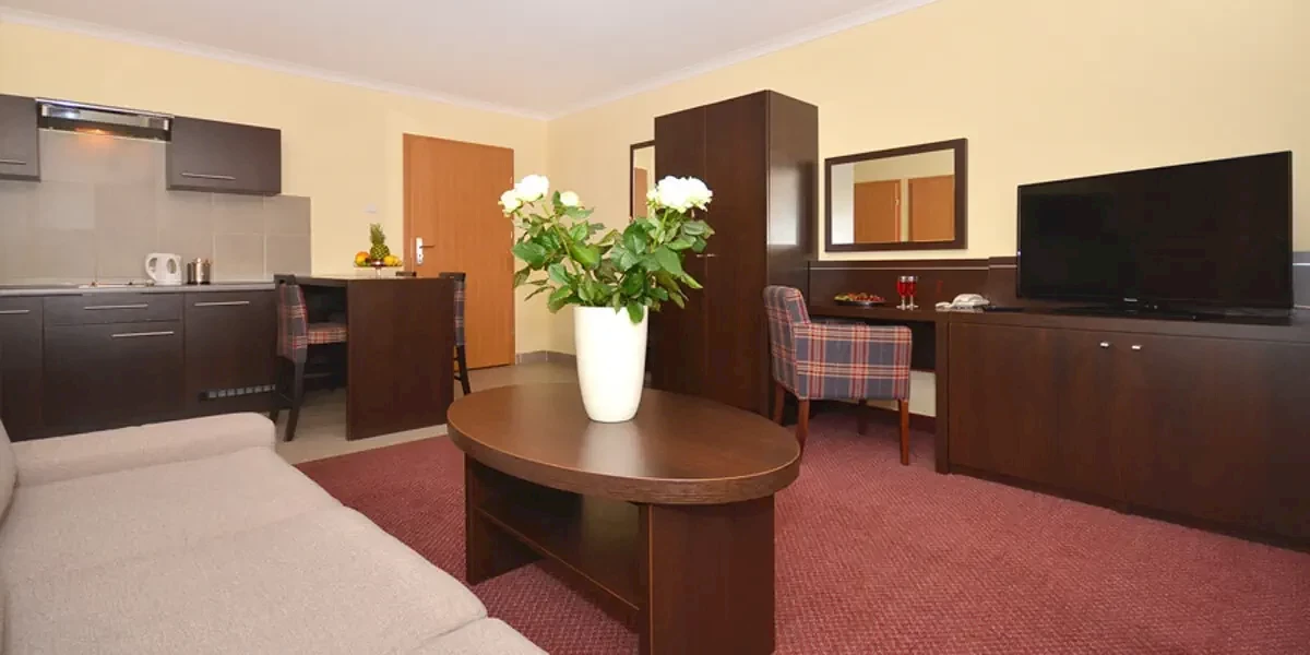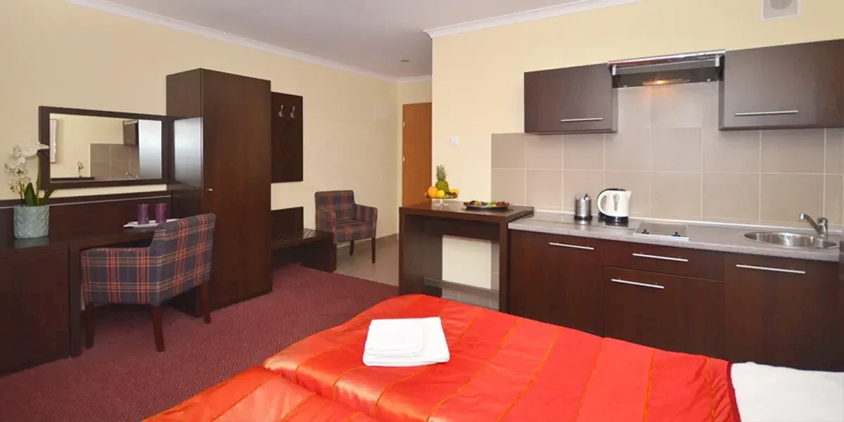 Komfortowy dwupokojowy apartament z widokiem na park, Tv, wifi, wyposażonym aneksem kuchennym oraz łazienką z kabiną prysznicową i suszarką do włosówPrezentowane w informacji opisy, opinie oraz zdjęcia przedstawiają subiektywne odczucia ich autora i nie stanowią części oficjalnego opisu obiektu organizatora turystyki (przedsiębiorcy turystycznego). Pokoje oraz udogodnienia mogą się różnić od zawartych w informacji, za co Travelplanet.pl S.A. nie ponosi odpowiedzialności. Oficjalny opis dostarczony przez organizatora turystyki znajdziesz na stronie poświęconej wybranej przez Ciebie imprezie turystycznej, po wskazaniu interesującego Cię terminu wyjazdu.