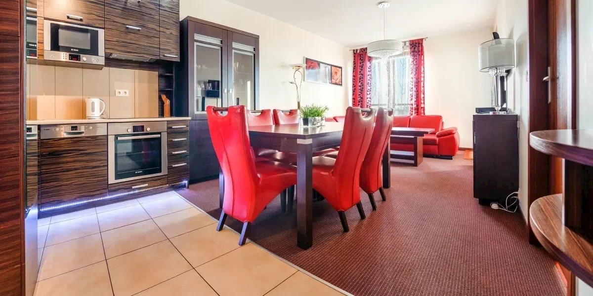 Komfortowy dwupokojowy apartament wyposażony w telewizor z płaskim ekranem, bezprzewodowy internet, ekspres do kawy, deskę do prasowania, żelazko, czajnik elektryczny, płytę kuchenną, mikrofalę oraz przybory kuchenne. Apartament dysponuje prywatną łazienką z kabiną prysznicową, a w niektórych również pralką.Oferta