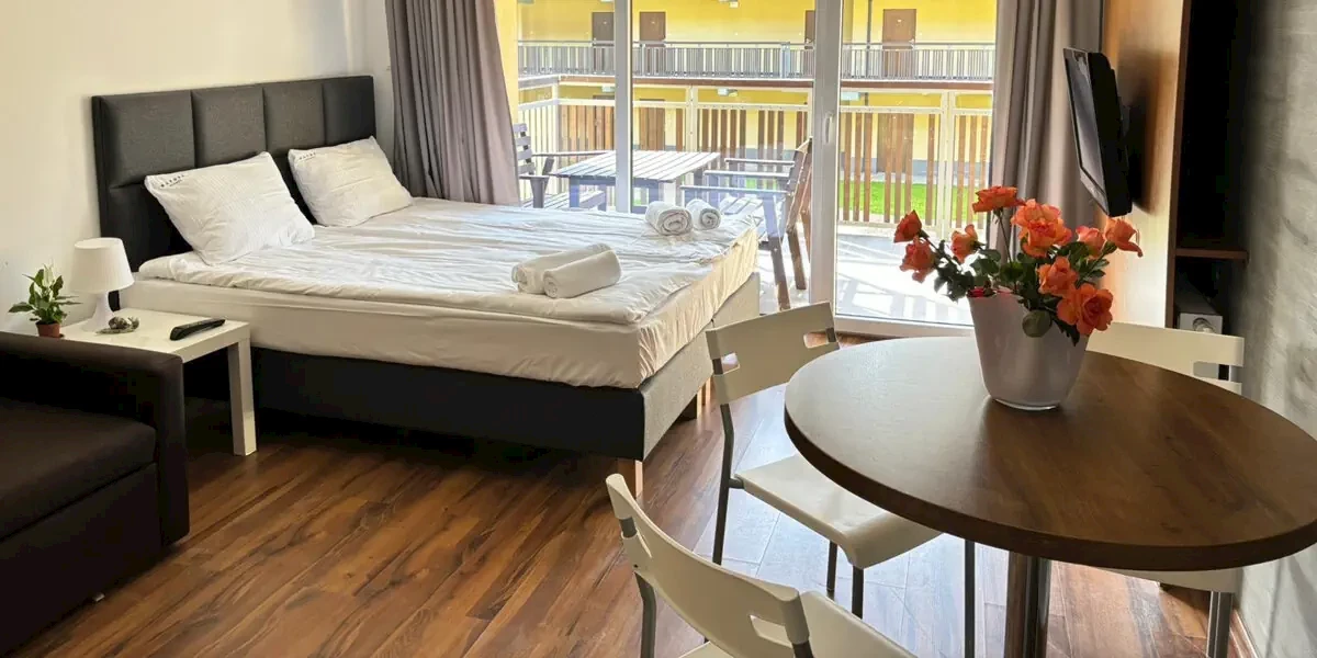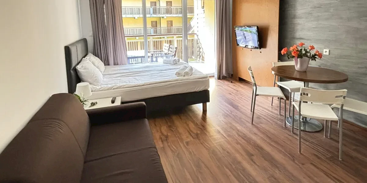 Apartament z balkonem/tarasem (26 m2). W wyposażeniu: TV, WI-FI, zestaw do parzenia kawy/herbaty, aneks kuchenny z lodówką, płytą indukcyjną, czajnikiem elektrycznym i zastawą stołową. Prywatna łazienka z prysznicem i ręcznikami. Sprzęt plażowy- parawan oraz leżaki.Prezentowane w informacji opisy, opinie oraz zdjęcia przedstawiają subiektywne odczucia ich autora i nie stanowią części oficjalnego opisu obiektu organizatora turystyki (przedsiębiorcy turystycznego). Pokoje oraz udogodnienia mogą się różnić od zawartych w informacji, za co Travelplanet.pl S.A. nie ponosi odpowiedzialności. Oficjalny opis dostarczony przez organizatora turystyki znajdziesz na stronie poświęconej wybranej przez Ciebie imprezie turystycznej, po wskazaniu interesującego Cię terminu wyjazdu.