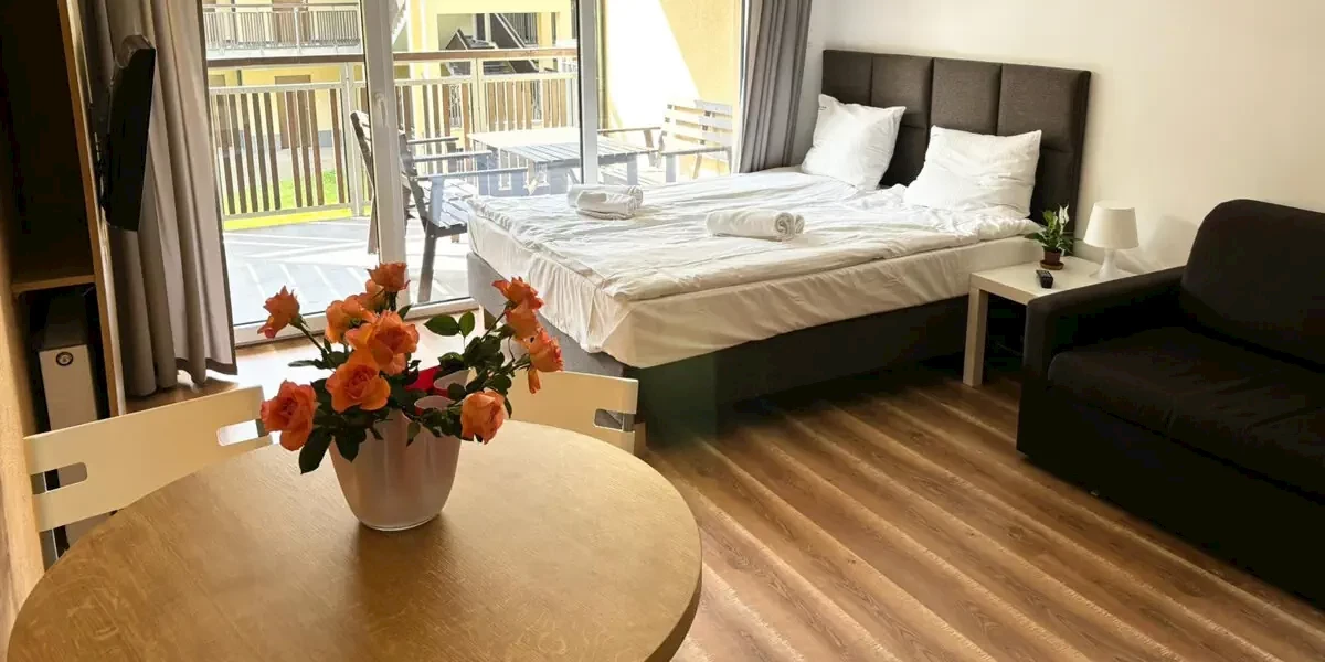 Apartament z tarasem (30 m2). W wyposażeniu: TV, WI-FI, zestaw do parzenia kawy/herbaty, aneks kuchenny z lodówką, płytą indukcyjną, czajnikiem elektrycznym i zastawą stołową. Prywatna łazienka z prysznicem i ręcznikami. Sprzęt plażowy- parawan oraz leżakiOferta
