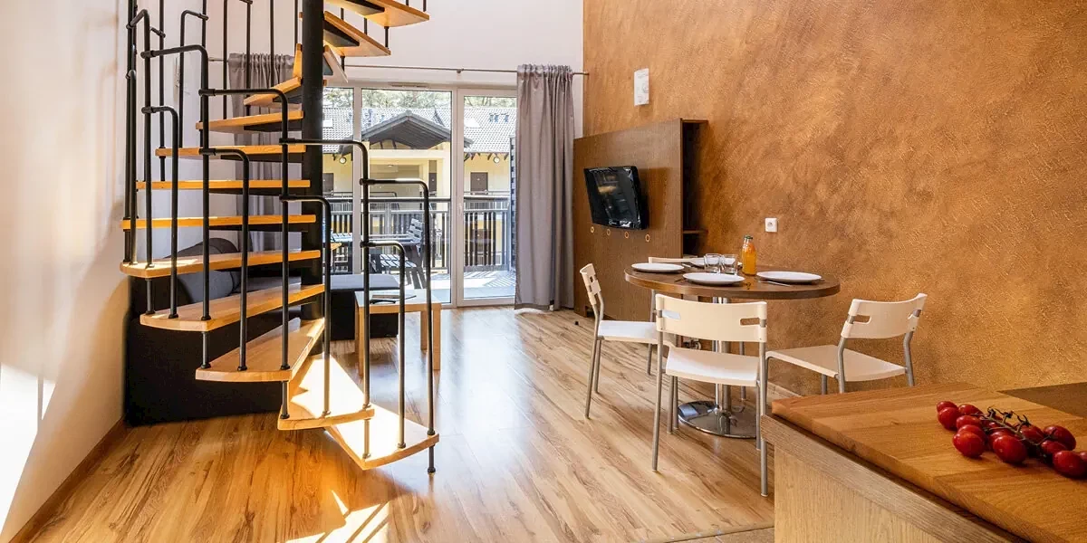 Apartament z tarasem (26 m2). W wyposażeniu: TV, WI-FI, zestaw do parzenia kawy/herbaty, aneks kuchenny z lodówką, płytą indukcyjną, czajnikiem elektrycznym i zastawą stołową. Prywatna łazienka z prysznicem i ręcznikami. Sprzęt plażowy- parawan oraz leżaki.Apartament dwupoziomowy z tarasem