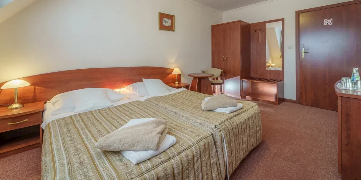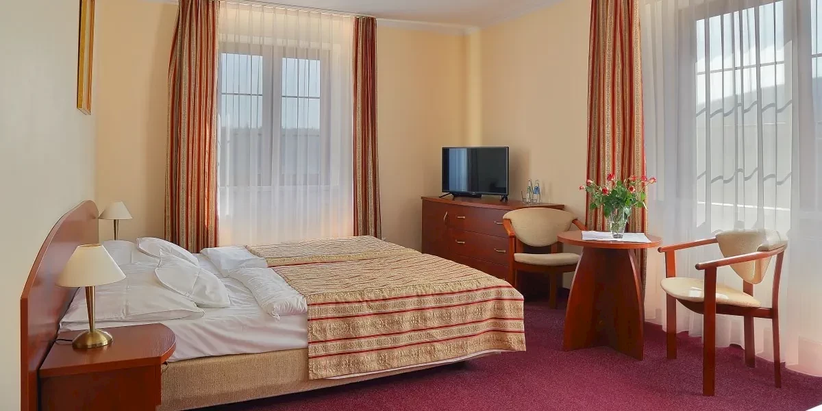 Klasycznie urządzony pokój z widokiem na las. W wyposażeniu: 2 łóżka pojedyncze z możliwością złączenia, łazienka z kabiną prysznicową i suszarką do włosów, kosmetyki hotelowe, ręczniki, TV, telefon, sejf, lodówkę, dostęp do bezprzewodowego internetu. Wszystkie pokoje przeznaczone są dla osób niepalących.Prezentowane w informacji opisy, opinie oraz zdjęcia przedstawiają subiektywne odczucia ich autora i nie stanowią części oficjalnego opisu obiektu organizatora turystyki (przedsiębiorcy turystycznego). Pokoje oraz udogodnienia mogą się różnić od zawartych w informacji, za co Travelplanet.pl S.A. nie ponosi odpowiedzialności. Oficjalny opis dostarczony przez organizatora turystyki znajdziesz na stronie poświęconej wybranej przez Ciebie imprezie turystycznej, po wskazaniu interesującego Cię terminu wyjazdu.