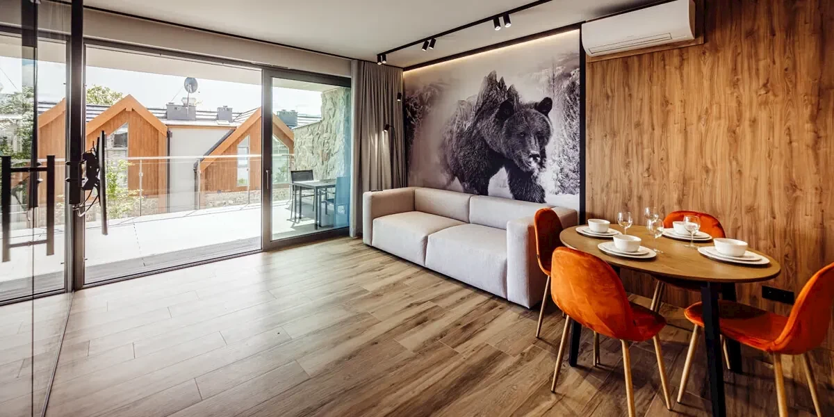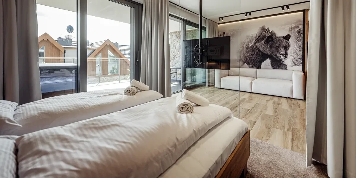 Komfortowy apartament z tarasem z prywatnym jacuzzi i widokiem na góry, sauną w łazience, pokojem dziennym z aneksem kuchennym i odrębną sypialnią z podwójnym łóżkiem. Dostawki na rozkładanej sofie w saloniePrezentowane w informacji opisy, opinie oraz zdjęcia przedstawiają subiektywne odczucia ich autora i nie stanowią części oficjalnego opisu obiektu organizatora turystyki (przedsiębiorcy turystycznego). Pokoje oraz udogodnienia mogą się różnić od zawartych w informacji, za co Travelplanet.pl S.A. nie ponosi odpowiedzialności. Oficjalny opis dostarczony przez organizatora turystyki znajdziesz na stronie poświęconej wybranej przez Ciebie imprezie turystycznej, po wskazaniu interesującego Cię terminu wyjazdu.
