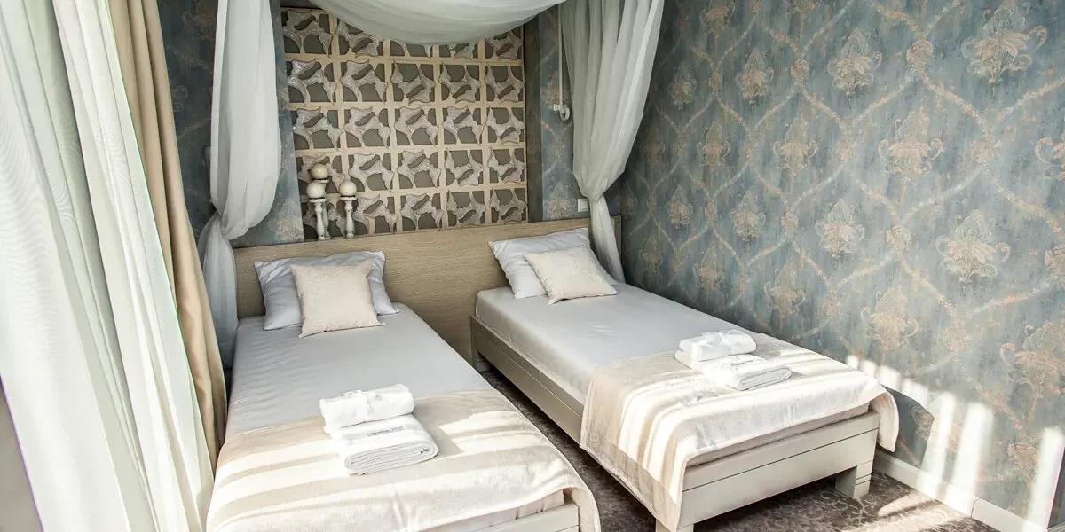Indywidualnie urządzony pokój z dwoma łóżkami pojedynczymi z możliwością złączenia. W wyposażeniu: klimatyzacja, Wi-Fi, minibar, czajnik, łazienka z prysznicem, szlafrokami, ręcznikami i kosmetykami.Oferta