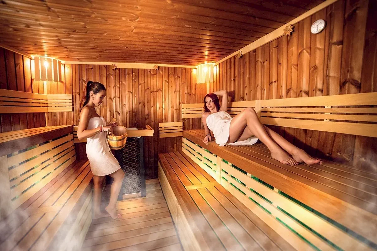 - basen z leżakami, zewnętrzny podgrzewany basen z jacuzzi i leżakami, basen dla dzieci z brodzikiem ze stali nierdzewnej i fontanną, zewnętrzna podgrzewana bania drewniana, jacuzzi, sauna (fińska, solna, aromatyczna), tepidarium , kąpiel lodowa, wielofunkcyjny prysznic, kącik relaksacyjny z leżakami, ścieżka Kneippa, masaże, usługi kosmetyczne