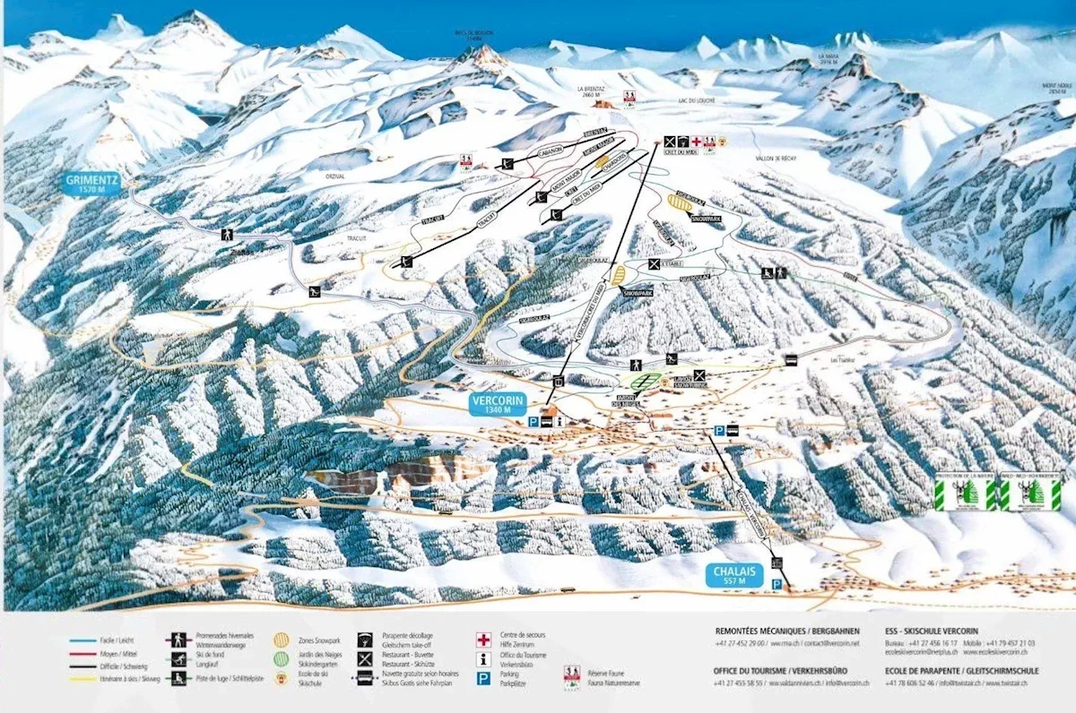 Maks. wysokość: 2374 mMin. wysokość: 1340 mWys. miejscowość: 1330 mWyciągi łącznie: 9Orczyki: 5Krzesełka: 1Gondole: 3Trasy łącznie: 35 kmTrasy zielone/niebieskie: 13 kmTrasy czerwone: 19 kmTrasy czarne: 3 kmRegion narciarski Val d'Anniviers