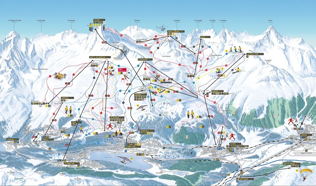 Maks. wysokość: 3022 mMin. wysokość: 1720 mWys. miejscowość: 1822 mWyciągi łącznie: 28Orczyki: 11Krzesełka: 12Gondole: 5Trasy łącznie: 155 kmTrasy zielone/niebieskie: 42 kmTrasy czerwone: 79 kmTrasy czarne: 34 kmRegion narciarski ENGADIN St. Moritz Mountain Pool