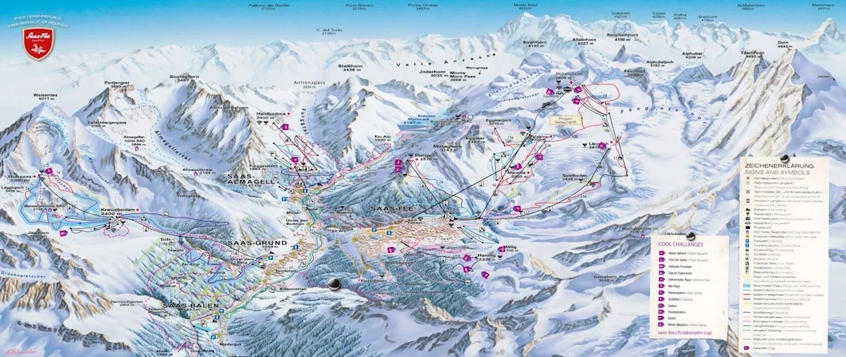 Maks. wysokość: 2347 mMin. wysokość: 1684 mWys. miejscowość: 1672 mWyciągi łącznie: 7Orczyki: 5Krzesełka: 2Trasy łącznie: 15 kmTrasy zielone/niebieskie: 7 kmTrasy czerwone: 8 kmRegion narciarski Saas Valley