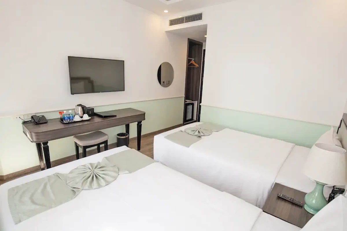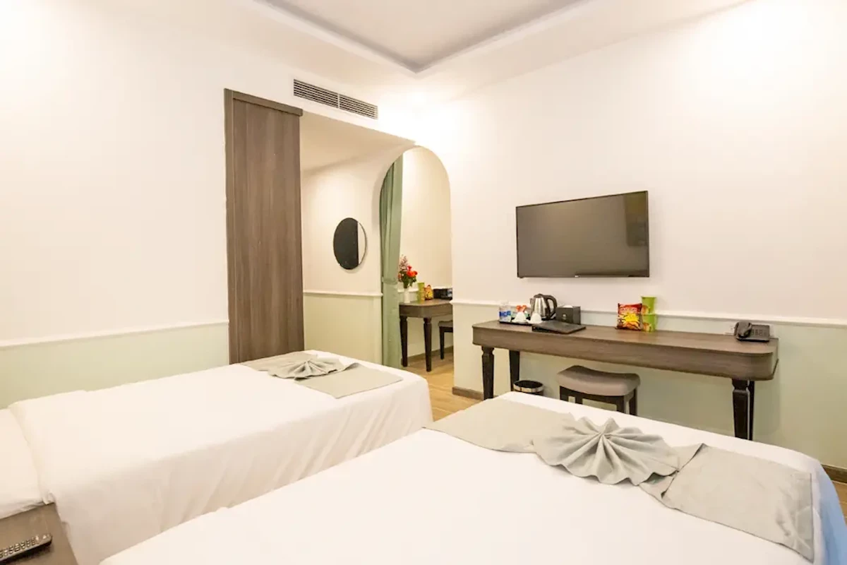 Dla max. 3 osób, Kanały telewizji: Angielski, Telefon w pokoju, prysznic, Powierzchnia pokoju: ok. 23 - 25 m2, Rodzaj podłogi: płytki, Sprzątanie codziennie, 1 sypialnia, Maksymalna liczba osób dorosłych: 2, Maksymalna liczba dzieci: 2, Widok na miasto, Liczba łazienek: 1, Liczba toalet: 1, Zestaw do parzenia kawy i herbaty, Klimatyzacja: Klimatyzacja indywidualnaPlaża