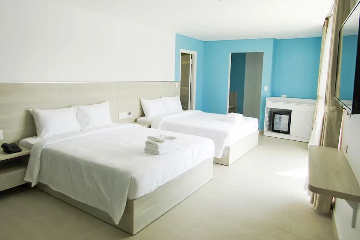 Dla max. 4 osób, Przestrzeń zewnętrzna: Balkon, Kanały telewizji: Angielski, Telefon w pokoju, prysznic, Powierzchnia pokoju: ok. 35 - 37 m2, Rodzaj podłogi: płytki, Sprzątanie codziennie, 1 sypialnia, Maksymalna liczba osób dorosłych: 3, Maksymalna liczba dzieci: 2, Widok na miasto,Widok na ogród,Częściowy widok na jezioro, Liczba łazienek: 1, Liczba toalet: 1, Zestaw do parzenia kawy i herbaty, Klimatyzacja: Klimatyzacja centralna, Działa w godzinach: 24hQUAD ROOM WITH BALCONY