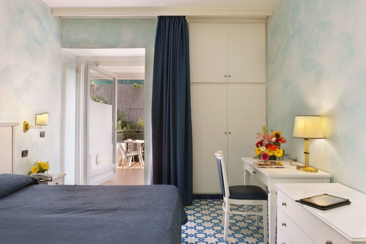 - 16-20 m2, dwuosobowy, Superior, strona basenu, widok na morze (częściowo boczny), prysznic lub wanna, toaleta, suszarka do włosów, klimatyzacja, minibar za opłatą, sejf, telewizor (TV-SAT), WiFi, balkon