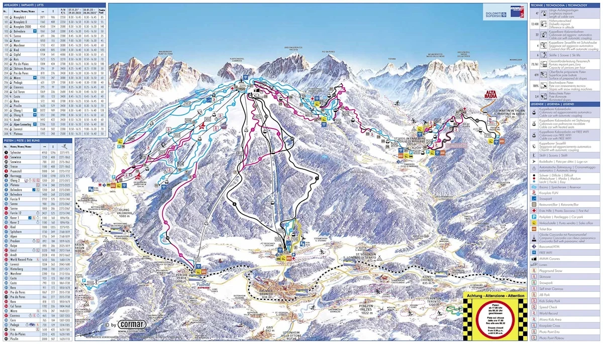 Maks. wysokość: 2275 mMin. wysokość: 973 mWys. miejscowość: 1087 mWyciągi łącznie: 31Orczyki: 6Krzesełka: 4Gondole: 21Trasy łącznie: 121 kmTrasy zielone/niebieskie: 58 kmTrasy czerwone: 34 kmTrasy czarne: 29 km