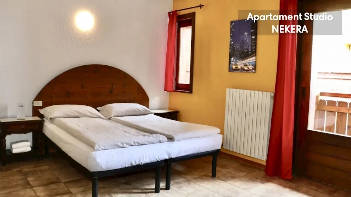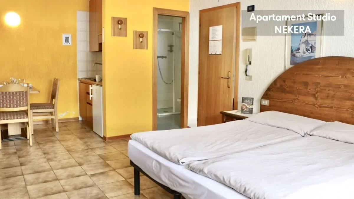 Apartament Studio: ok. 25 – 32 m2, na pierwszym lub drugim piętrze, mogący zakwaterować do trzech osób, jedno łóżko podwójne lub dwa łóżka pojedyncze i sofa dla trzeciej osoby, aneks kuchenny, stolik z krzesłami, prywatna łazienka (prysznic, toaleta, umywalka, suszarka do włosów). Apartament z jedną sypialnią: ok. 40 m2, na parterze, drugim lub trzecim piętrze mogący zakwaterować do czterech osób, sypialnia z łóżkiem podwójnym i część dzienna z sofą i aneksem kuchennym, pokoje na drugim i trzecim piętrze dysponują balkonem; poza tym wyposażony jak Apartament Studio. Apartament z dwoma sypialniami dla 4 osób: ok. 45 m2, na parterze, mogący zakwaterować do czterech osób, sypialnia z łóżkiem podwójnym, sypialnia z dwoma łóżkami pojedynczymi, część dzienna z aneksem kuchennym i stołem, dwie łazienki; poza tym wyposażony jak Apartament Studio.Wyżywienie