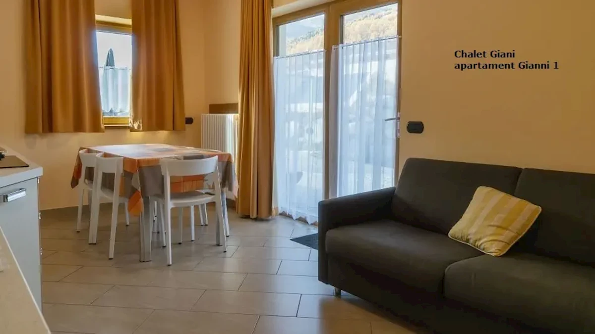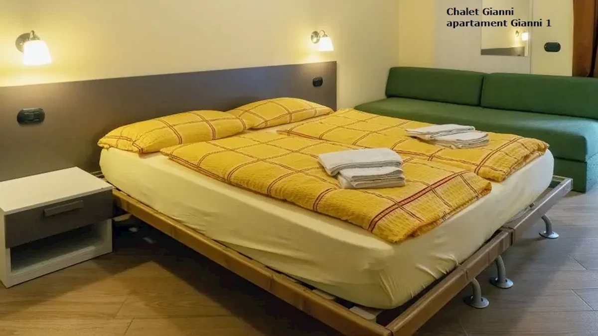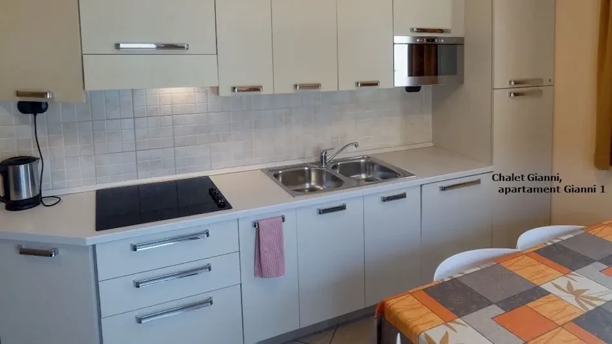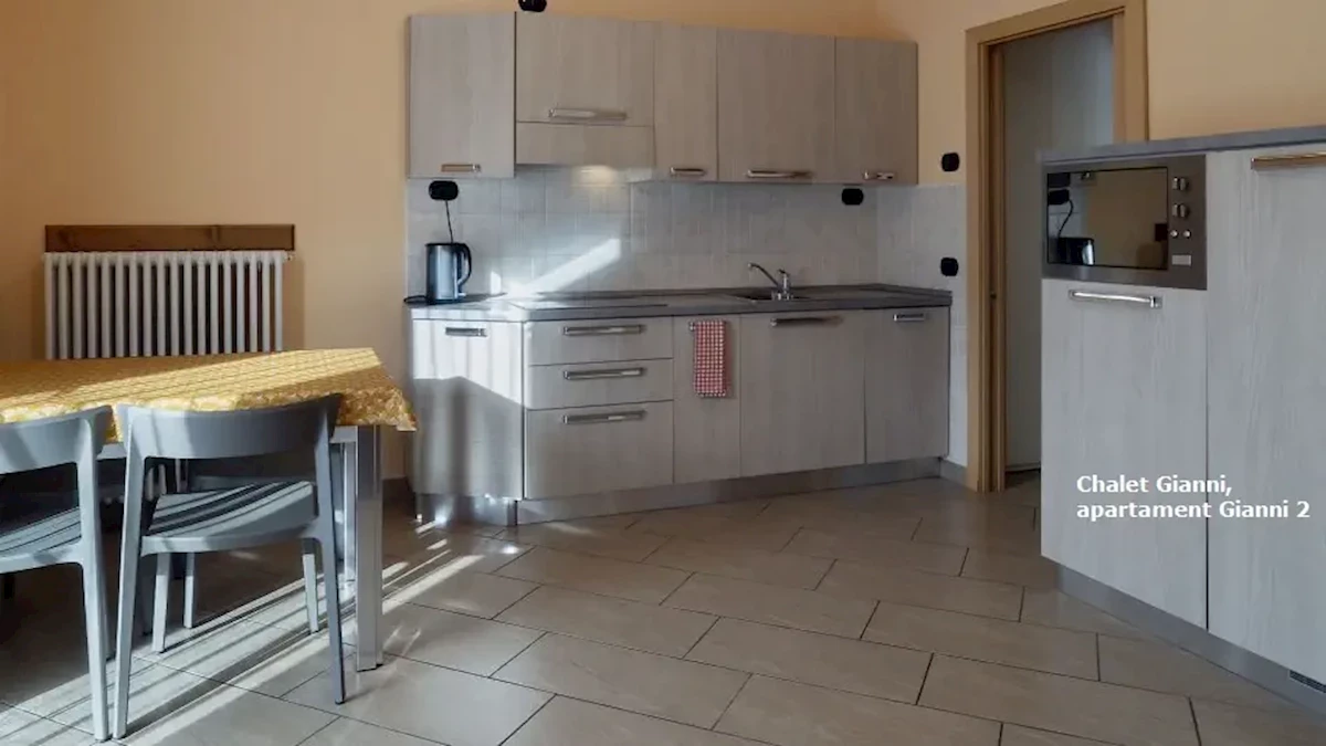usytuowany na parterze, składa się z sypialni (z bezpośrednim wyjściem na zewnątrz) z łóżkiem małżeńskim, pokoju dziennego z rozkładaną podwójną sofą wraz z aneksem kuchennym w pełni wyposażonym (naczynia, sztućce, kuchenka, lodówka, kuchenka mikrofalowa, zmywarka do naczyń). Łazienka z WC; suszarka do włosów, pralka, TV-sat.Apartament „Gianni 3” bilo dla 4 osób