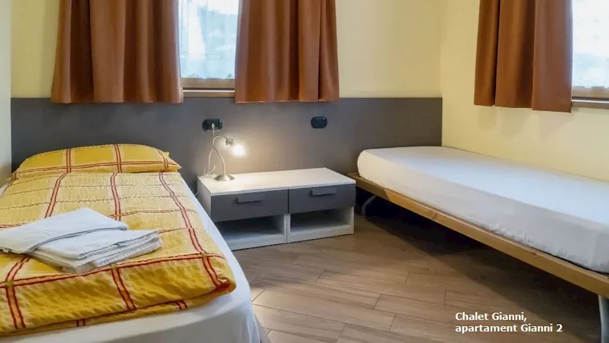 usytuowany na parterze, składa się z 2 sypiali (1 z bezpośrednim wyjściem na zewnątrz) z dwoma pojedynczymi łóżkami (możliwość połączenia) oraz pokoju dziennego z rozkładaną podwójną sofą wraz z aneksem kuchennym w pełni wyposażonym (naczynia, sztućce, kuchenka, lodówka, kuchenka mikrofalowa, zmywarka do naczyń). Łazienka z WC; suszarka do włosów, pralka, TV-sat.Apartament „Gianni 2” bilo dla 4 osób