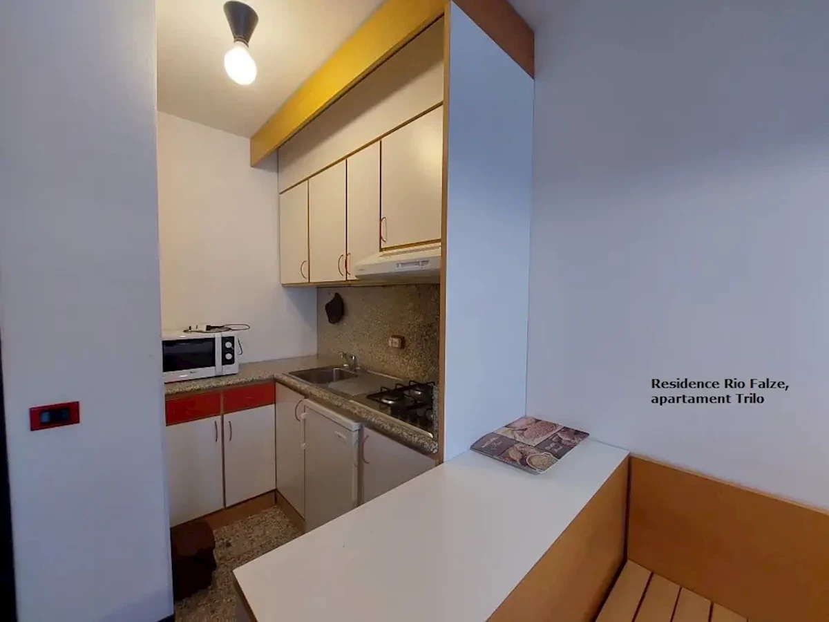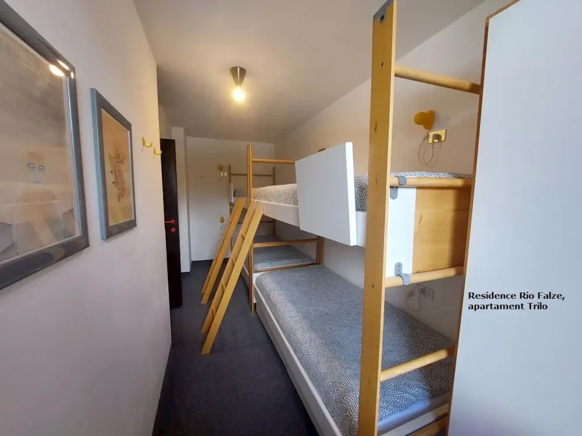 (ok. 45-50 m2) składa się z sypialni z łóżkiem małżeńskim i wnęki sypialnej z łóżkiem piętrowym, pokoju dziennego z dwoma łóżkami (sofa), aneksu kuchennego w pełni wyposażonego (naczynia, sztućce, kuchenka, lodówka). Łazienka z WC, TV, telefon.Apartament typ B1 Trilo 6-8 osobowy