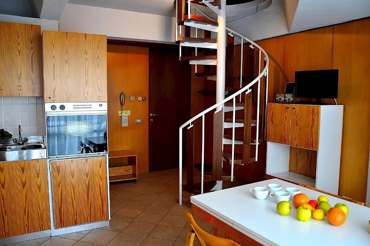 składa się z pokoju dziennego z rozkładaną sofą oraz dwoma lub trzema pojedynczymi łóżkami lub łóżkiem podwójnym i pojedynczym, aneksu kuchennego w pełni wyposażonego (naczynia, sztućce, kuchenka elektryczna, zmywarka, lodówka) oraz otwartej sypialni na piętrze z podwójnym łóżkiem lub łóżkami piętrowymi. W większości apartamentów część sypialna oddzielona jest przesuwnym panelem lub szafą od części dziennej Łazienka z WC, suszarka do włosów; telefon, TV.Pieski