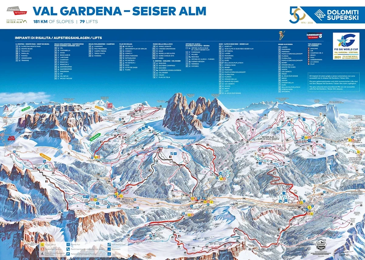 Maks. wysokość: 2518 mMin. wysokość: 1236 mWys. miejscowość: 1060 mWyciągi łącznie: 79Orczyki: 24Krzesełka: 40Gondole: 15Trasy łącznie: 181 kmTrasy zielone/niebieskie: 52 kmTrasy czerwone: 108 kmTrasy czarne: 21 kmRegion narciarski Dolomiti Superski