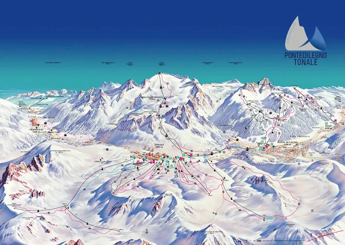 Adamello Ski-Area (Ponte di Legno-Tonale-Temu), wys. 1121-3016 m. n.p.m., 28 nowoczesnych wyciągów narciarskich: 19 wyciągów orczykowych, 4 wyciągi kabinowe, 3 wyciągi orczykowe, 2 magiczne dywany. 42 trasy narciarskie o łącznej długości ok. 100 m: 24 km (10 tras) niebieskich - łatwych; 61 km (25 tras) czerwonych - średnich, 15 km (6 tras) czarnych - trudnych.Oferta Skipass w cenie