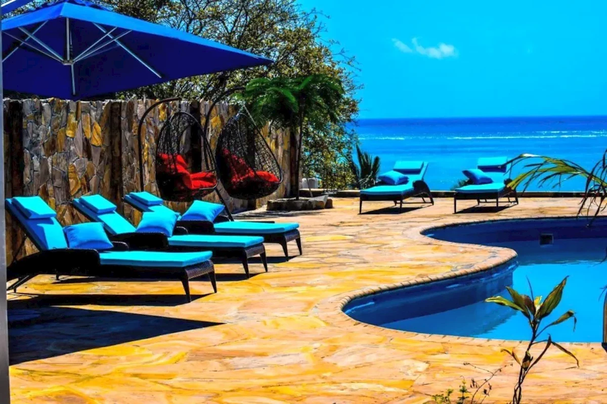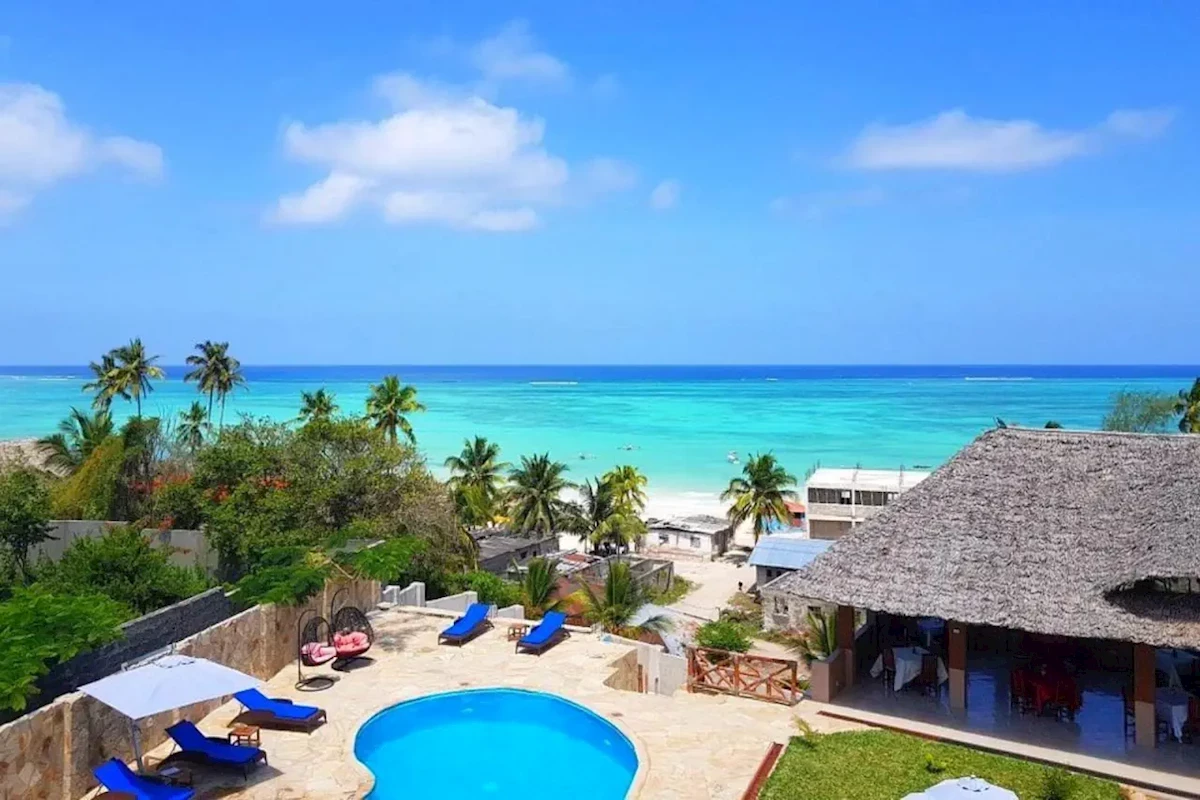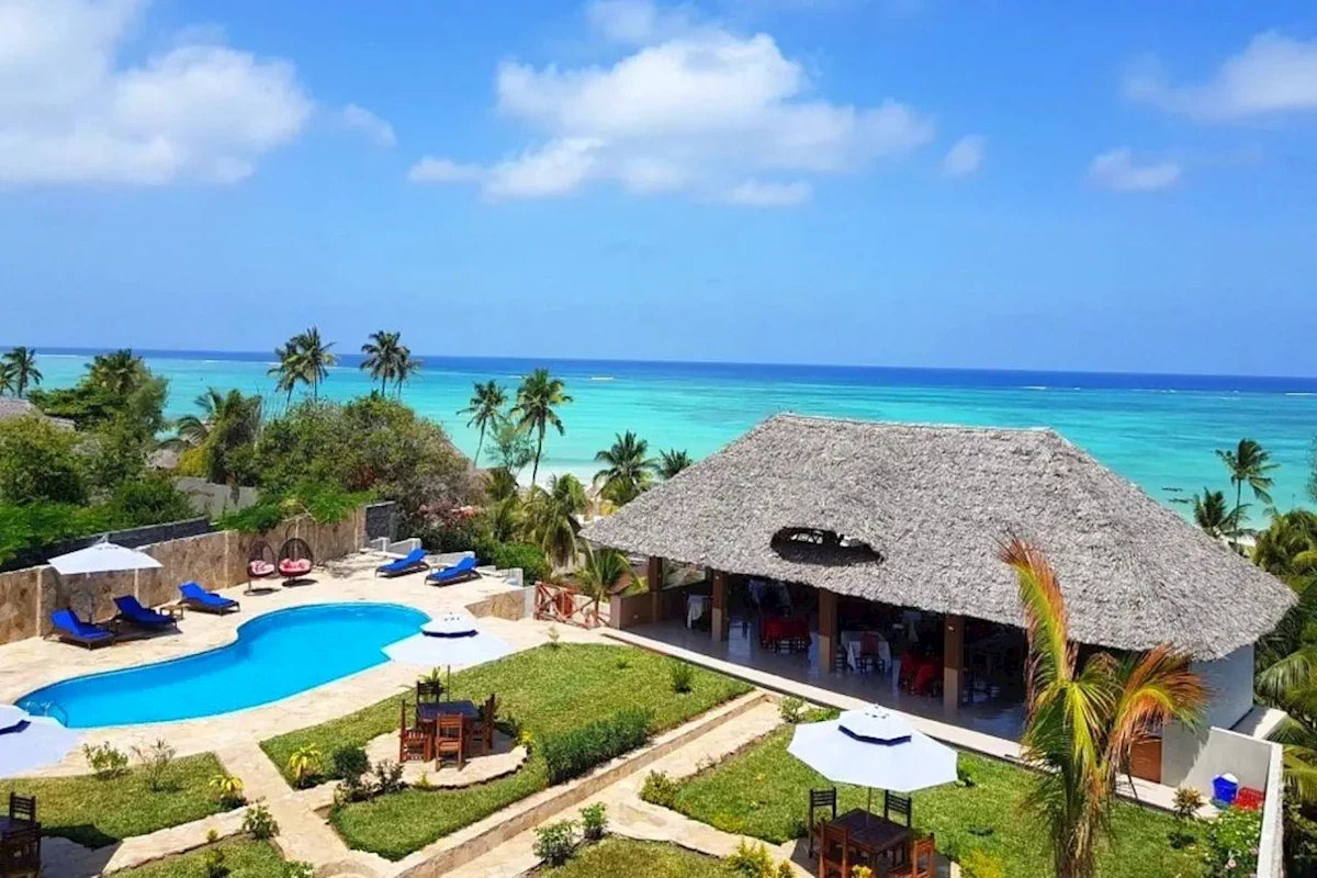 Przy plaży (bezpłatne leżaki i parasole, ręczniki za depozytem, niedaleko brzegu są koralowce, przyda się specjalne obuwie), ok. pół kilometra od Kiwengwa, sklepików i barów, ok. 50 km od Stown Town, 55 km od lotniska.Wyposażenie